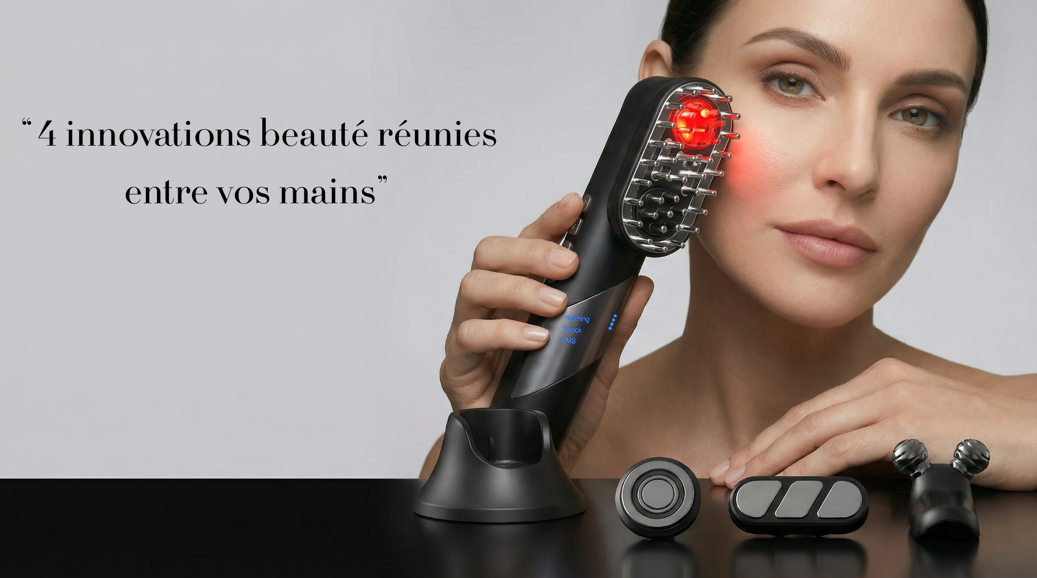 Retrouvez l'ovale de vos 20 ans. Une chaleur douce et contrôlée stimule la production naturelle de collagène : votre ovale se redessine, vos traits s'affinent, vos rides s'atténuent progressivement. Dès les premières séances, votre visage paraît plus ferme, plus jeune, plus harmonieux. 10 minutes le soir suffisent pour un résultat digne d'un institut.